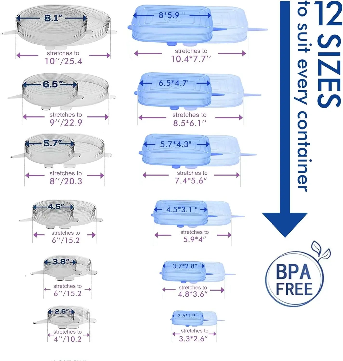 12pcs Silicone Stretch Lids Round Rectangle Magic Lids Reusable Food Covers for Bowls Cups Cans Shapes of Container Dishwasher